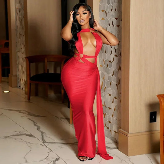 DS164 Style Hollow out Belted Wrap Dress Spring Summer Women's Cross-Border Fashion round Ring Design Ankle-Length Gown
