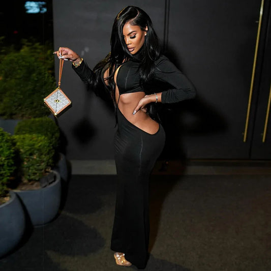 DSMTRC Hollow Out Womens Irregular Waistless Backless Sexy Coquette Dresses Full Sleeve Stretch Skinny Clubwear Hipster Vestidos