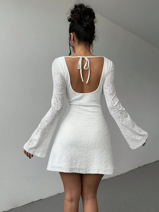 Hot girl backless strappy slightly sexy A-line dress, pure and unconventional design with flared sleeves and A cinched waist, au