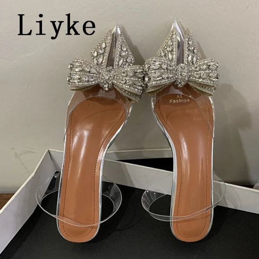 Liyke Fashion Design Crystal Bowknot Women Pumps Sexy Pointed Toe Clear High Heels Wedding Prom Shoes PVC Transparent Sandals