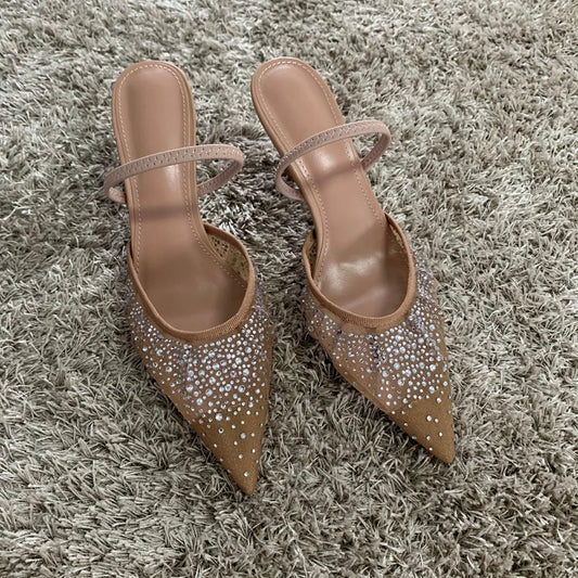 New Summer Women's Sandals Rhinestone Bright Mesh High Heels Footwear Elegant Slingback Pointed Slip on Party Lady Pumps Shoes