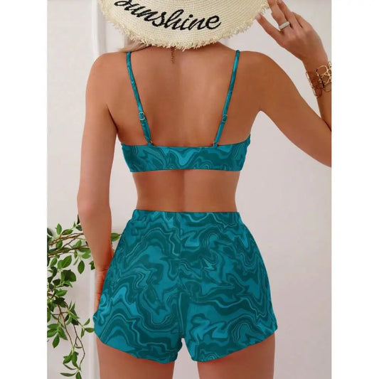 Cikini Women's Vacation Marble Print Casual Bikini Set, Three-Piece Bikini Set With Cover-Up Shorts, Random Print Summer Beach