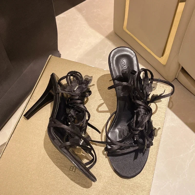 Cross Ankle Strap Women Sandals 2025 Summer Pink Heels Fashion Open Toe Butterfly Floral Shoes Elegant Stripper Party Sandalias