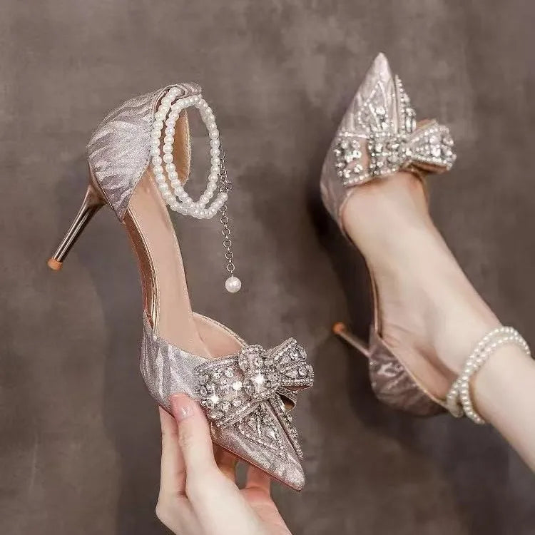 Crystal high-end feel, water diamond bow one-button high heels, women's pointed toe thin heels, silver wedding shoes