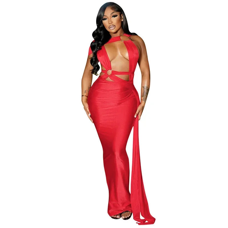 DS164 Style Hollow out Belted Wrap Dress Spring Summer Women's Cross-Border Fashion round Ring Design Ankle-Length Gown