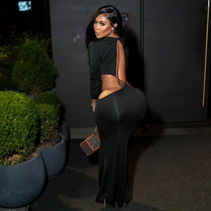 DSMTRC Hollow Out Womens Irregular Waistless Backless Sexy Coquette Dresses Full Sleeve Stretch Skinny Clubwear Hipster Vestidos