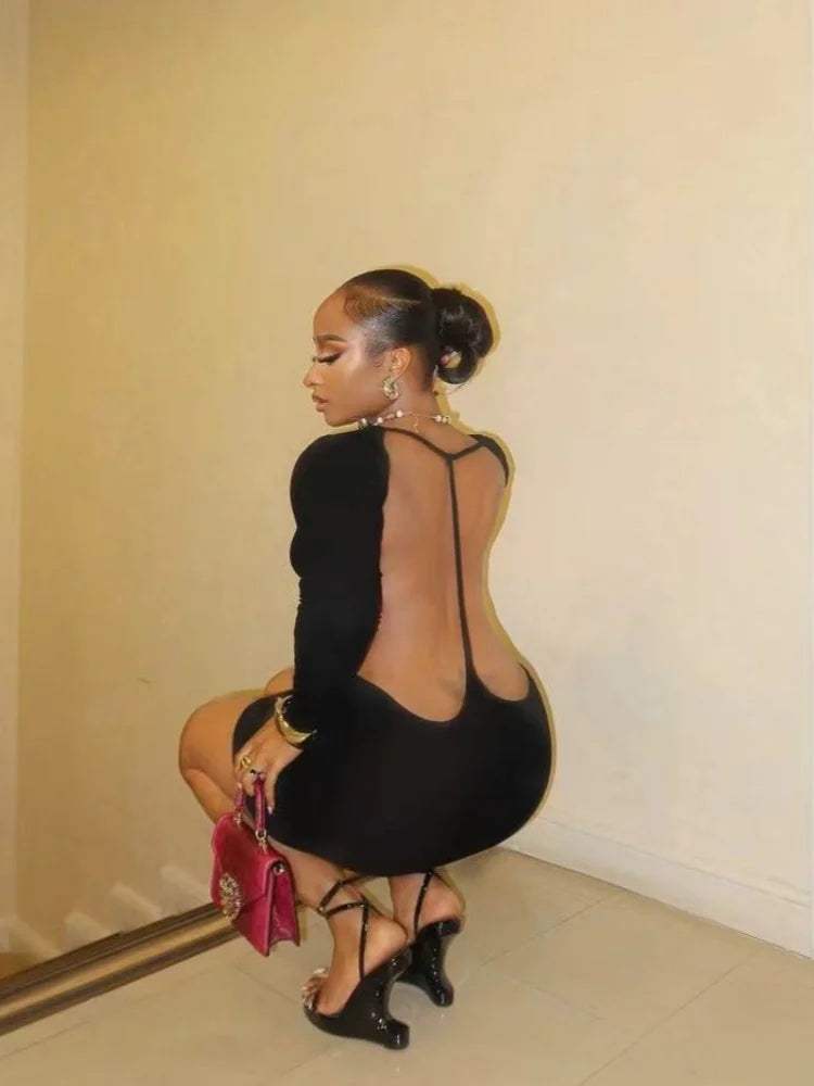 Joskaa Elegant Hollow Out Mini Black Dress Women Sexy O-Neck Long Sleeve Backless Body-Shaping Vestidos Autumn Party Clubwear
