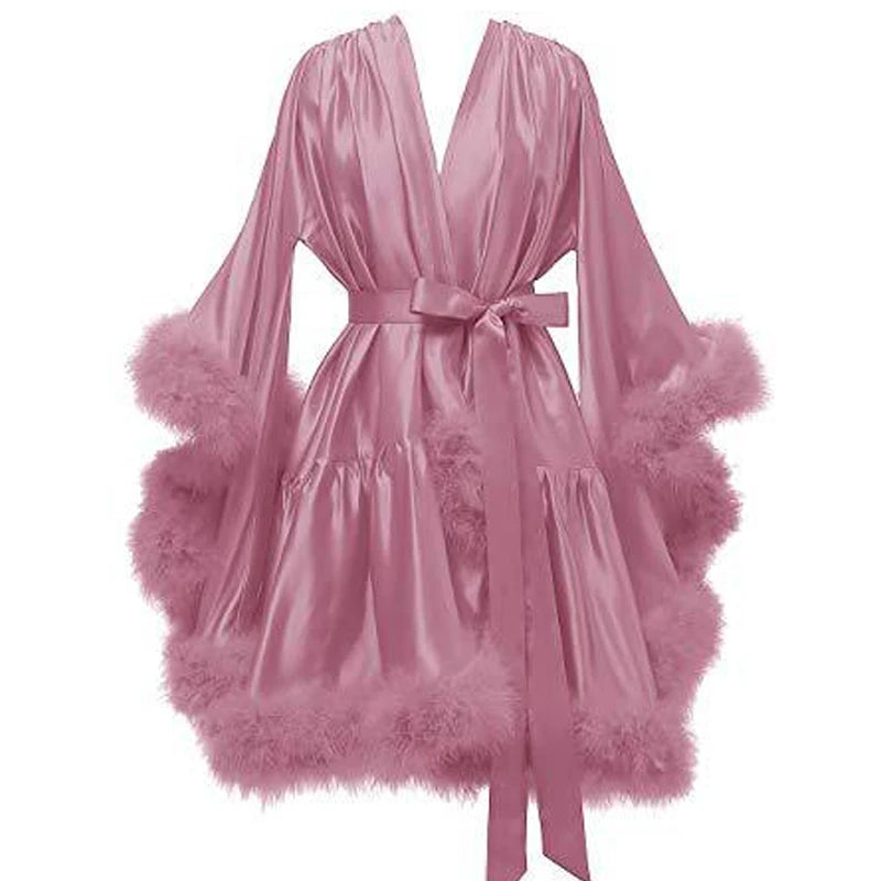 Ostrich Feathers Good Quality in Stock Women Lingerie Fur Robe Luxury Silk Prom Dress Party Gowns Sexy Evening Elegant Dress