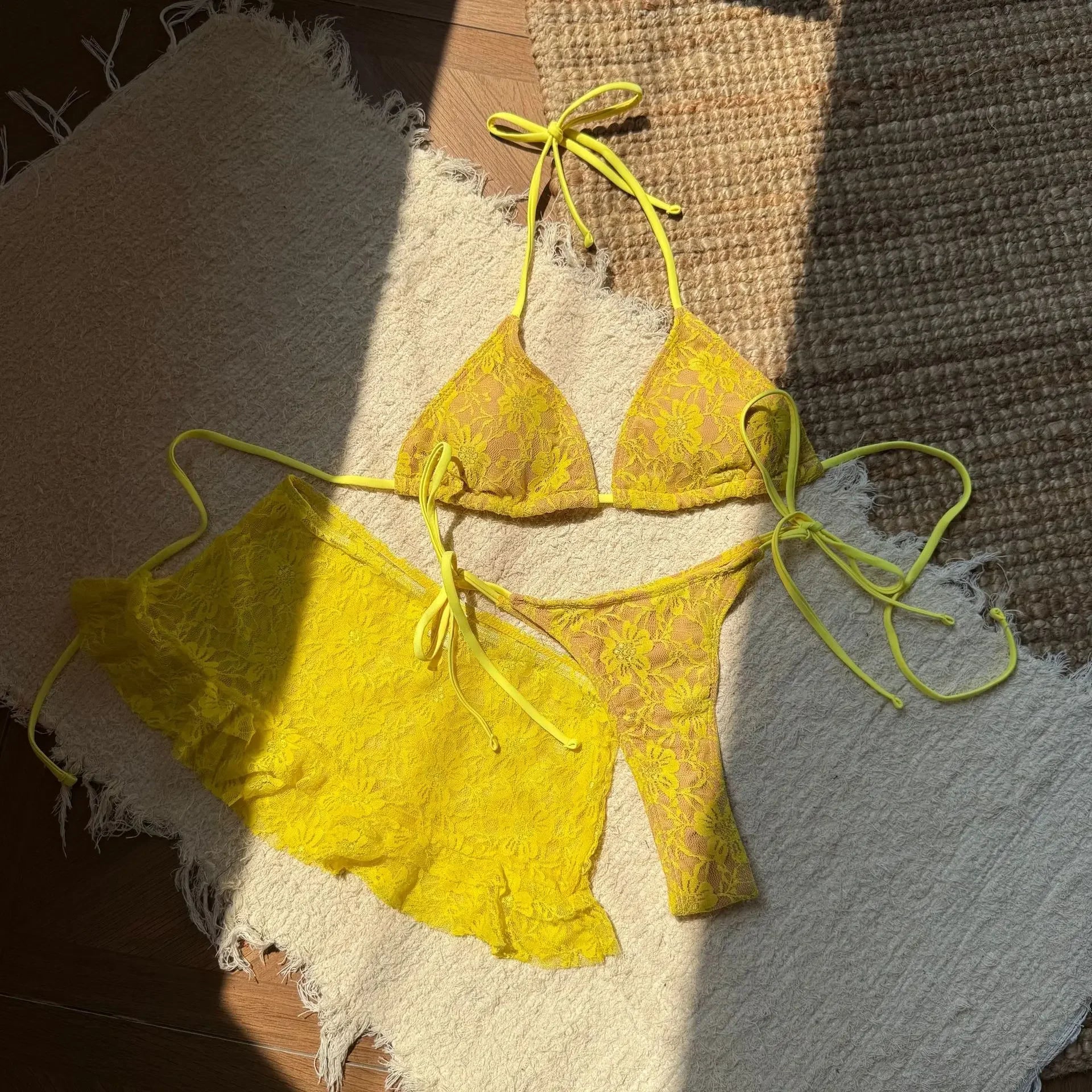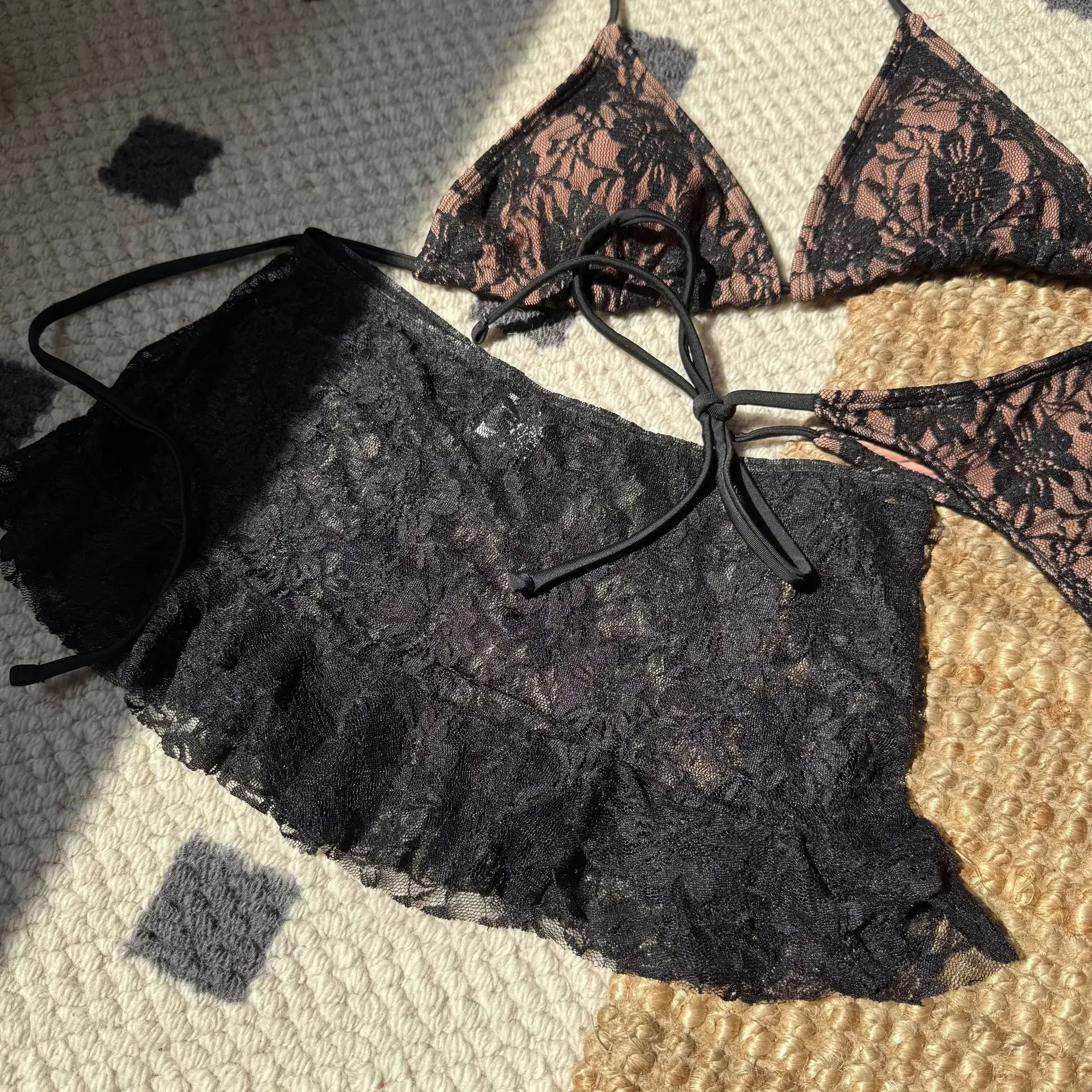 Sexy Lace Micro Mini String Halter Tie Bikinis Sets 3pcs with Ruffles Mini Skirt Black Red Color Swimwear Swimsuit Bathing Suit