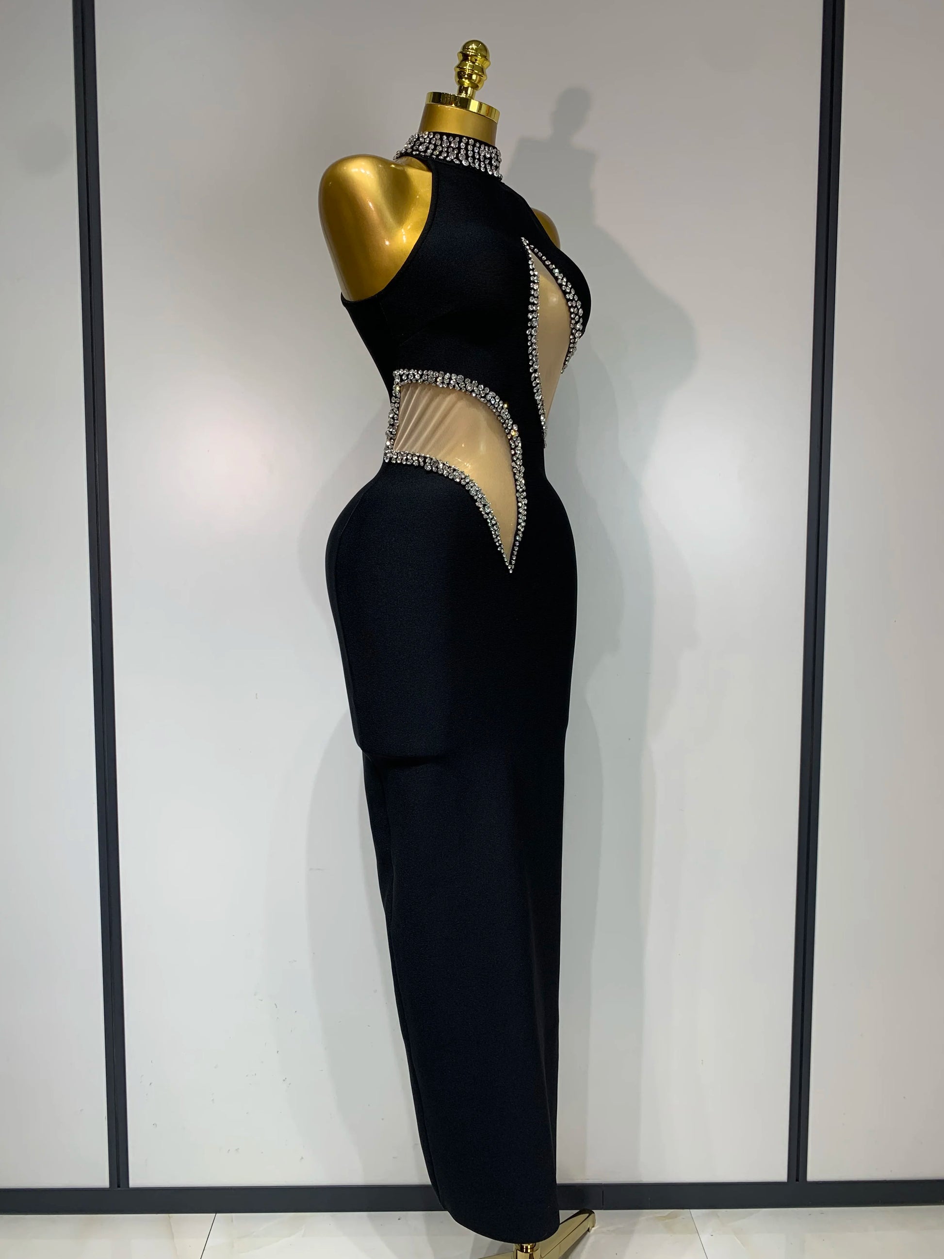 Women Sexy Rhinestone Black Sleeveless Mesh Patchwork New Arrival Stretch Bodycon Bandage Party Dresses Elegant Birthday Dress